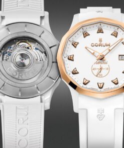 Swiss luxury watchmaker CORUM has expanded its prestigious Admiral collection by integrating ceramics into the design, a material with deep roots in the maritime industry due to its robustness and eco-friendliness. In embracing ceramics, known for its striking visuals, pleasant feel, and being lighter and more resistant than traditional 316L steel, CORUM marries the aesthetic of high-end watchmaking with practicality. Admiral 42 Ceramic collection is a testament to this fusion, featuring Ceramic & Gold models that epitomize the elegance of high-tech materials combined with the classic allure of gold. With options available in both stark black and pristine white ceramics, these watches are attached to a vulcanized rubber strap, ensuring comfort and durability. They are detailed with gold-colored indices and hands, enhancing their luxurious appearance, and are water-resistant up to 50 meters, making them suitable for seafaring activities. Powering these timepieces is the precise CO 395 automatic movement, ensuring 40 hours of power reserve and operating at 28,800 vibrations per hour, which guarantees accuracy. The inclusion of a sapphire crystal case back reveals the intricate workings of the movement, underscoring CORUM’s dedication to transparency and fine craftsmanship.