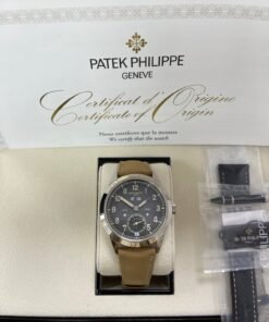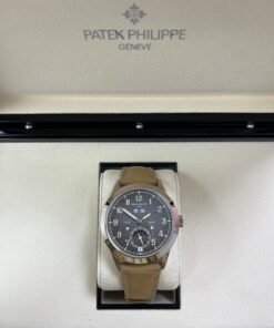 No less than eight patent requests have been filed for this Caliber 31-260 PS QA LU FUS 24H, relating to elements improving precision, efficiency, reliability, security and user friendliness. This model comes in a new Calatrava-type case rimmed with a Clous de Paris hobnail guilloched pattern. The vintage-style dial is distinguished by its anthracite color and its slightly grainy texture reminiscent of oldtimer cameras. This new reference is teamed with two interchangeable straps: one in beige calfskin with a nubuck finish and the other in black calfskin with an embossed fabric motif and beige topstitching.