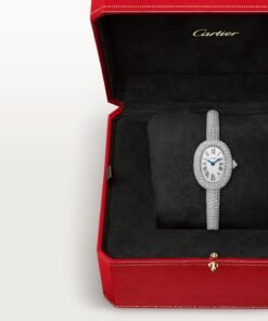 Baignoire de Cartier watch, mini model, size 16, quartz movement. Rhodium-finish 18K white gold (750/1000) case, rigid bracelet and beaded crown set with 552 brilliant-cut diamonds totaling 5 carats. Silvered dial, blued-steel sword-shaped hands, sapphire crystal. Length: 24.6 mm, width: 18.7 mm, thickness: 7.2 mm. water-resistant up to 3 bar (approx. 30 meters/100 feet).