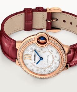 Ballon Bleu de Cartier watch, 33 mm. Self-winding mechanical movement. Rose gold 750/1000 case set with 47 brilliant-cut diamonds totaling 0.68 carats. Fluted crown decorated with a cabochon sapphire. Matt silvered stamped sunray dial set with 21 brilliant-cut diamonds totaling 0.10 carats. Blued-steel sword-shaped hands. Sapphire crystal. Burgundy alligator leather strap, rose gold 750/1000 ardillon buckle. Thickness: 0.4”. Water-resistant up to 3 bar (approx. 30 meters/100 feet).