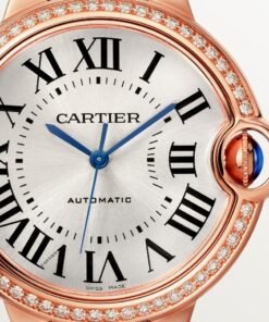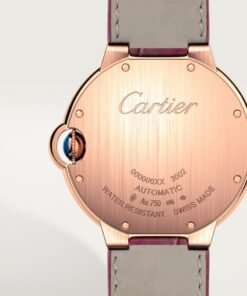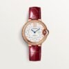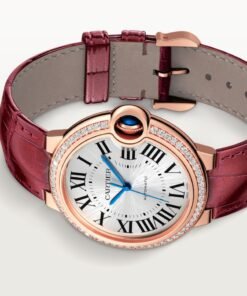 Ballon Bleu de Cartier watch, 36 mm, mechanical movement with automatic winding. 18K rose gold (750/1000) case set with 54 brilliant-cut diamonds totaling 0.79 carats. Fluted crown set with a cabochon sapphire. Silvered sunray dial. Blued-steel sword-shaped hands. Sapphire crystal. Burgundy alligator skin strap, 18K rose gold (750/1000) ardillon buckle. Case thickness: 12.10 mm. Water-resistant to 3 bar (approx. 30 meters/100 feet).