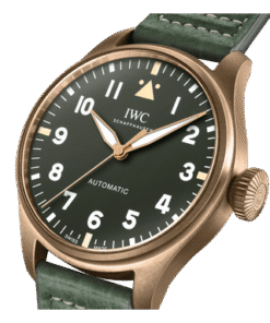 The Big Pilot’s Watch 43 Spitfire features a military aesthetic with a bronze case and crown, as well as a military green dial and gold-plated hands.