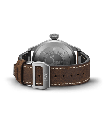 The Big Pilot’s Watch 43 Spitfire features a military aesthetic with a matte grey titanium case and crown, as well as a black dial in the design of historic observation watches.