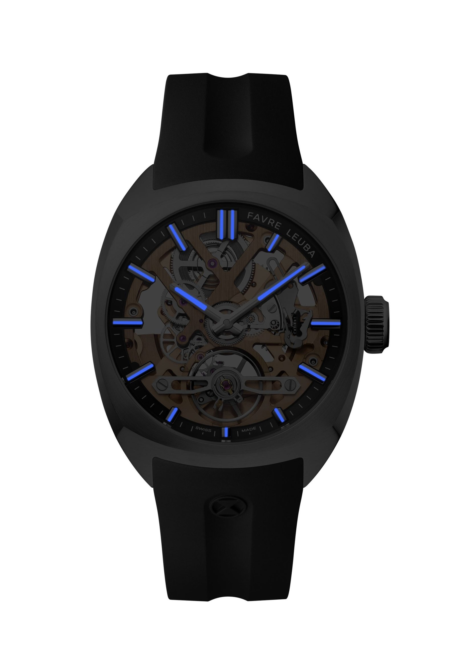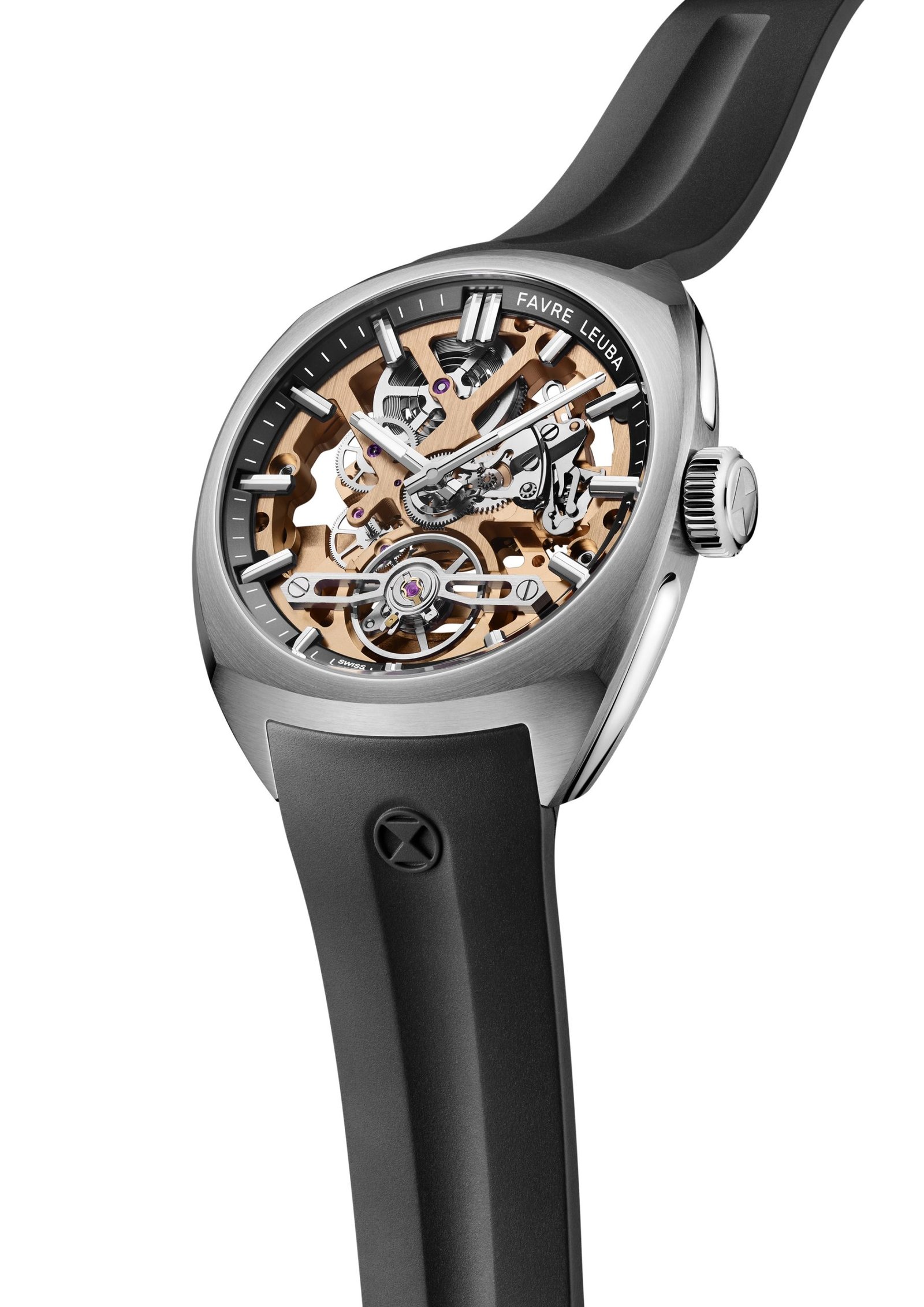 “For the first time in its 288-year history, Favre Leuba presents a fully skeletonized timepiece: the Chief Skeleton. It follows the Chief Tourbillon launched earlier this year and continues the brand’s renewed focus on technically ambitious complications within its bold Chief line. The watch stays true to Favre Leuba’s 1970s-inspired cushion case while introducing an openworked movement developed with AMT, giving a rare glimpse into the mechanical heart of the Chief series. Two editions are offered: a gold-toned caliber in polished steel, and an anthracite-finished version in black DLC-coated steel. The Chief Skeleton’s 40mm case combines brushed and polished surfaces, producing dynamic contrasts accentuated by a curved sapphire crystal with anti-reflective treatment. Inside, the movement architecture has been deliberately laid bare: a semi-exposed mainspring barrel at 12 o’clock balances against a visible balance wheel at 6 o’clock, while bridges and wheels are finished with a mix of snailing, satin brushing, and sandblasting. The movement beats at 28,800 vibrations per hour and delivers a 41-hour reserve. In both versions, a skeletonized rotor engraved with the Favre Leuba wordmark continues the design language, with the DLC model carrying the dark finish onto the rotor itself. Favre Leuba also introduces practical versatility, with a choice of can choose of green, blue, black, or ice-blue minute tracks, each with a FKM rubber strap. An integrated quick-change system allows seamless swaps between strap and bracelet. The Chief Skeleton is a reminder that Favre Leuba, even at 288 years old, still has the appetite to push its historic design codes into fresh, contemporary territory.”
