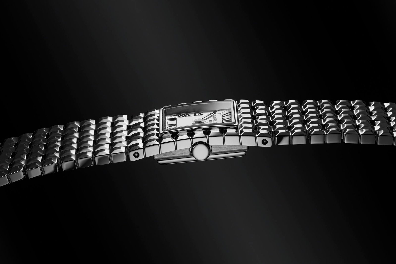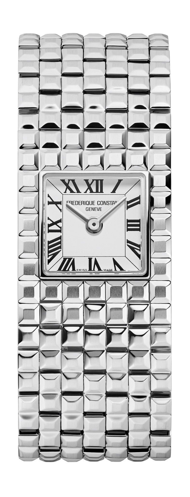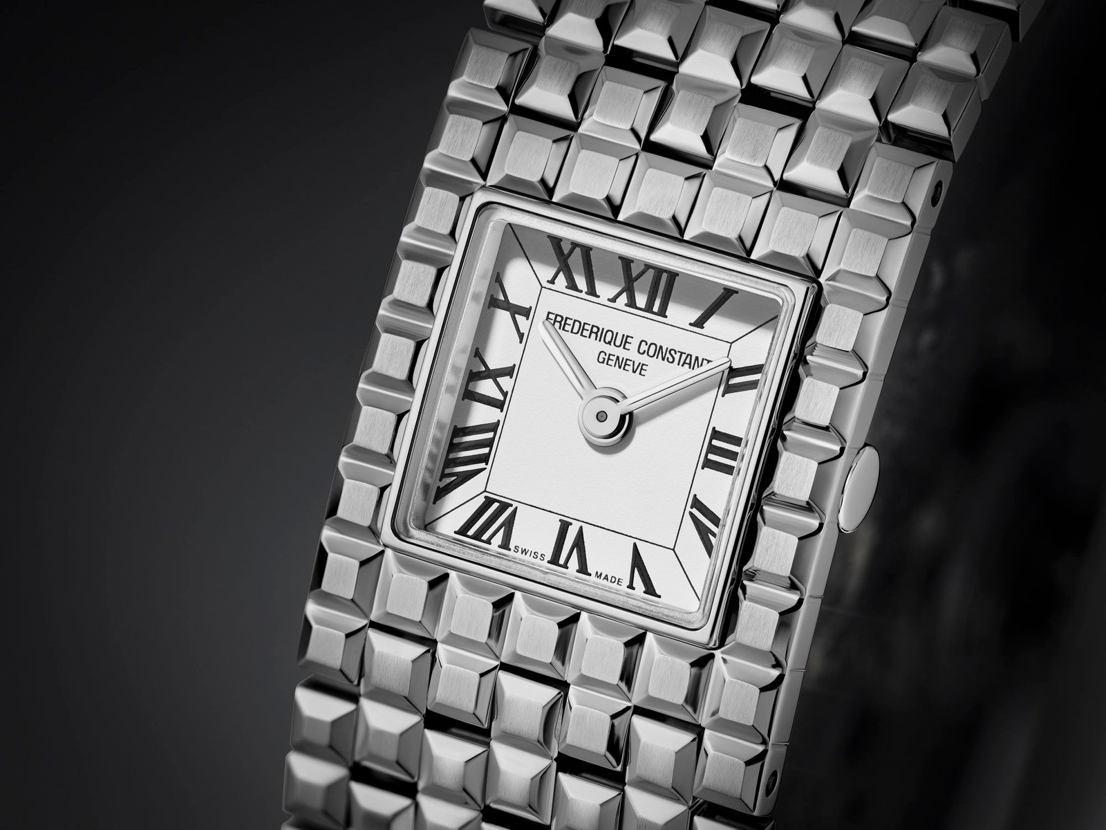 Frederique Constant brings back the Manchette after a two-decade hiatus, reintroducing it not as a heritage piece but as a deliberate nod to the irreverence of 1980s wristwear. Square dial, square bracelet links, and a sharp Clou de Paris motif across the whole thing. This isn’t a watch trying to be timeless. It’s doing exactly what the original did: turning heads and refusing to blend in. Classics Manchette collection comes in four variations, each with a different personality. Malachite green and deep black onyx for the mineral set. Matte silver for those who want a cleaner look with Roman numerals in play. And one with diamonds, 158 of them, for when understatement isn’t the point. In each case, the dial is small and discreet, leaving the bracelet to carry the attitude. A quartz calibre inside keeps things ticking for five years, which feels about right. The Classics Manchette skips over mechanical movements and legacy craftsmanship to deliver presence, posture and polish. Its invisible clasp and seamless silhouette keep the design clean, with nothing protruding or distracting. Whether you choose stone, silver or sparkle, the effect is the same: a knowing nod to the past, worn with modern flair.