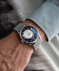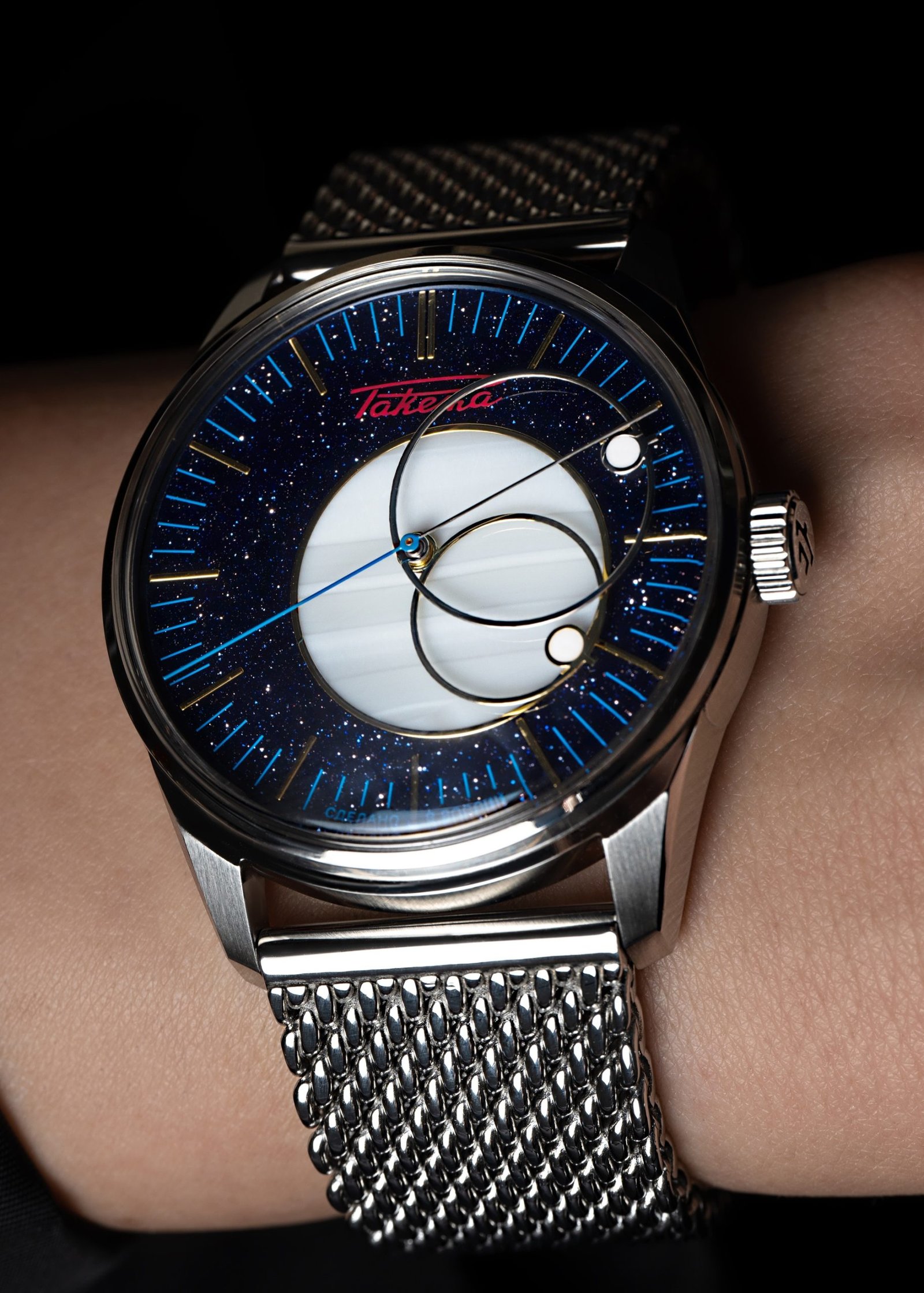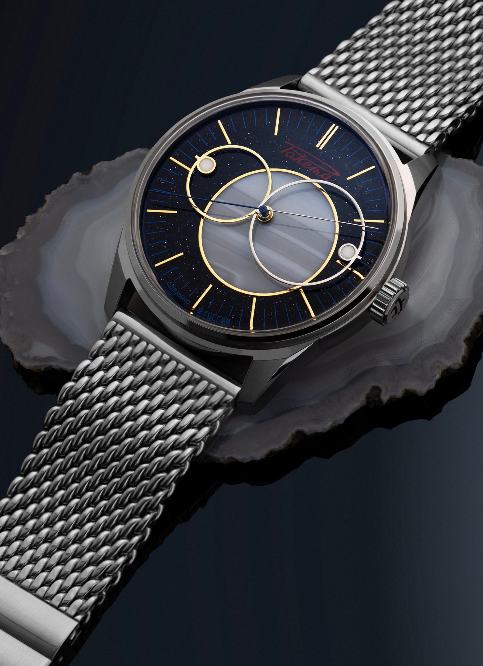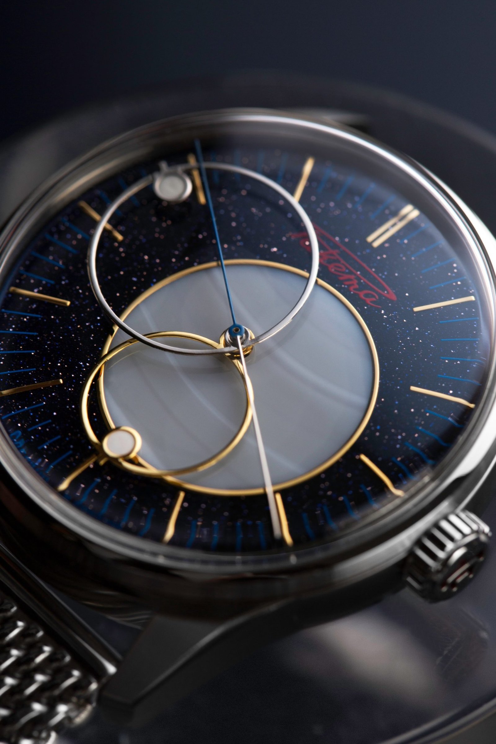 Raketa has just released an updated version of its classic Copernicus model, first introduced in 1965. The watch is a tribute to Nicolaus Copernicus, the renowned astronomer who changed the course of science in the 16th century by proving that the Earth orbits the Sun, not the other way around. In this new version, Raketa has designed the dial and hands to resemble planets revolving around the Sun, offering a unique and artistic interpretation of the Cosmos. The dial is made of aventurine, a stone that sparkles like a starry night sky, with the Sun represented by a circle of agate stone at the center. This “Copernicus” 0307 recalls the ancient way of telling time by observing the movement of celestial bodies. To read the time, you’ll follow the planet-shaped hands as they move around the Sun and relate to one another. The watch is completed with a Milanese mesh bracelet, adding a touch of elegance to its design. On the back, you’ll find the beautiful automatic movement, fully manufactured by the Raketa Watch Factory in Saint Petersburg, visible through the transparent case back.
