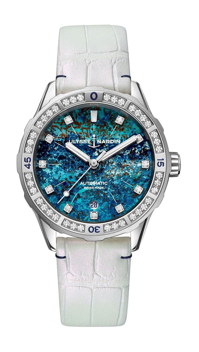 The Ulysse Nardin Diver collection celebrates the spirit of adventure with avant-garde designs and expert craftsmanship. The Diver [ATOLL], a limited edition of 100 pieces, features a unique chrysocolla stone-cut dial in vibrant blues and turquoises reminiscent of serene lagoons and coral reefs. Each dial is hand-cut, ensuring every watch is one-of-a-kind. This model follows previous editions with mother-of-pearl and aventurine dials.