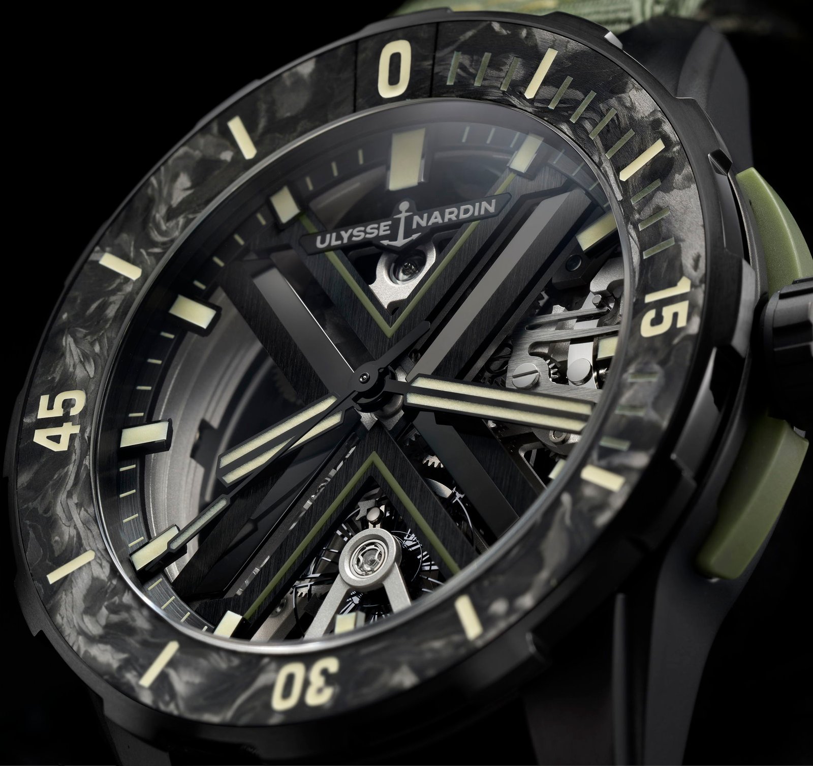 The Diver [X SKELETON OPS] is an avant-garde dive watch reimagined as Haute Horlogerie. It features a 44 mm case, water resistance up to 200 meters, and the skeletonized automatic movement UN-372 with a silicon escapement and oversized oscillator. The watch showcases Carbonium® in both the bezel and barrel cover. Its ultra-modern design includes a prominent skeleton X structure on the dial and a lightweight titanium case with a black DLC coating. Completing its bold style and sustainable approach is a khaki green fabric strap made partly from upcycled fishing nets or a green rubber strap.