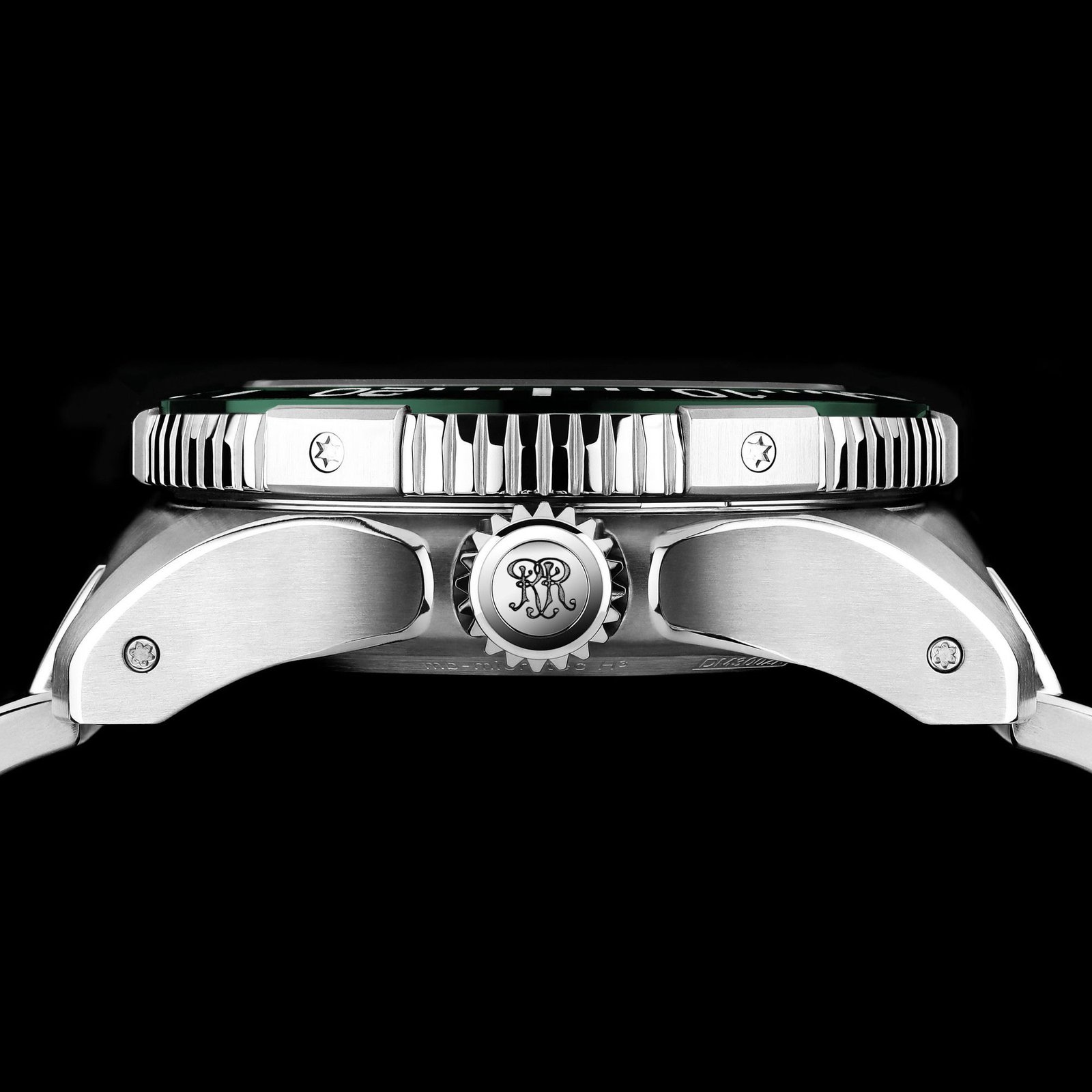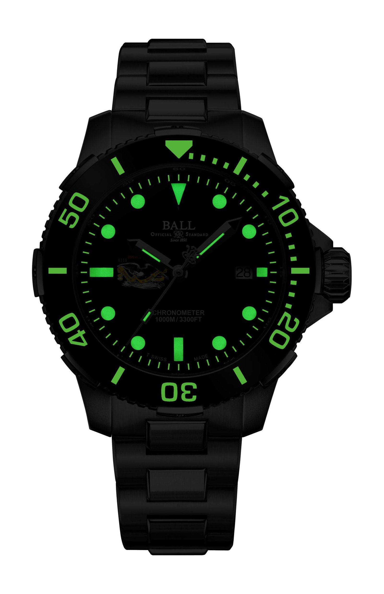 The BALL Engineer Hydrocarbon DeepQUEST Protector was created to mark the 250th anniversary of the U.S. Marine Corps, a fitting tribute to resilience and sacrifice. Its 42mm titanium monobloc case eliminates the need for a separate caseback, reinforcing strength while reducing potential weak points. The automatic helium release valve is built directly into the crown, a smart solution that allows gases to escape safely during decompression without compromising structure. Water resistant to 1,000 meters, the watch is designed for serious underwater use yet remains light and wearable on the wrist. Produced in just 250 pieces per colorway, in black or green, it offers both technical pedigree and exclusivity. Illumination is where BALL sets itself apart, and the DeepQUEST Protector highlights this expertise. Micro gas tubes, integrated beneath the dial and revealed through geometric cutouts, provide powerful and consistent visibility in absolute darkness. Their glow is complemented by a ceramic unidirectional bezel coated in Super-LumiNOVA, ensuring legibility and accurate timing for dives or daily challenges. The ceramic not only resists scratches and fading but also underscores the watch’s role as a reliable companion in demanding environments. What defines the DeepQUEST Protector is its blend of engineering and ethos. A COSC-certified chronometer caliber powers the watch with precision, while the fortress-like construction ensures toughness in the harshest conditions. Inspired by the Marine Corps’ legacy of courage and discipline, it stands as both tool and tribute. With this limited edition, BALL continues its mission to push boundaries while honoring those who safeguard freedom.