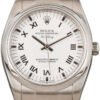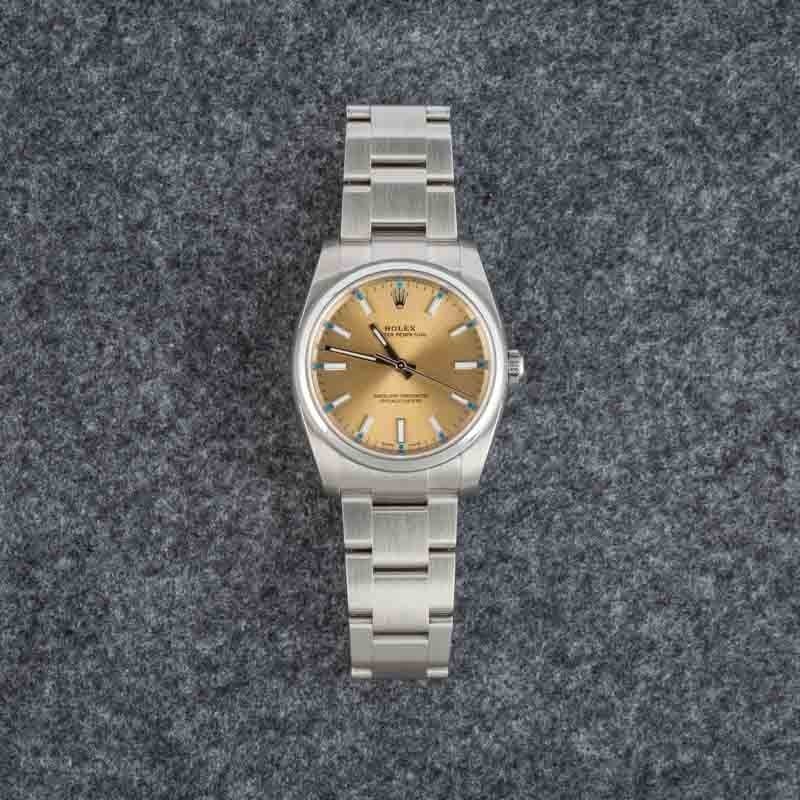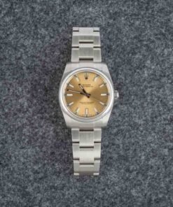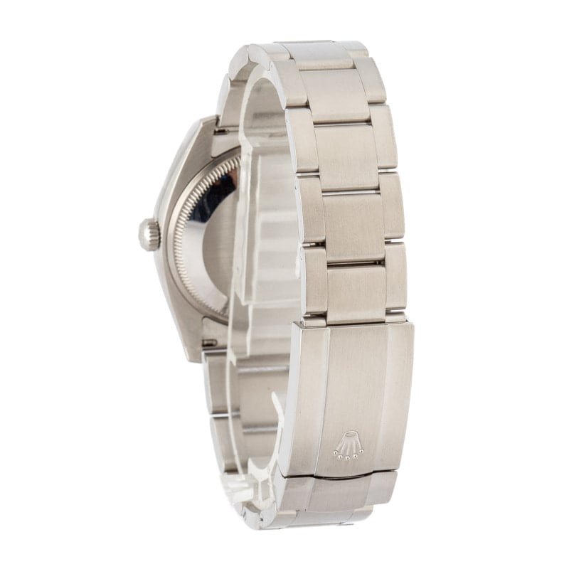 Rolex Oyster Perpetual 34 ref. 114200 (2019) features a 34mm stainless steel case with a smooth bezel and Oyster bracelet. The distinctive white grape dial adds a unique pop of color, while Rolex’s automatic movement delivers precision and reliability. A refined yet versatile timepiece that balances everyday wearability with timeless style.