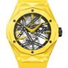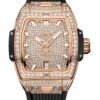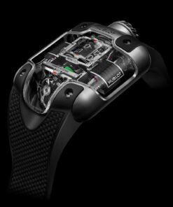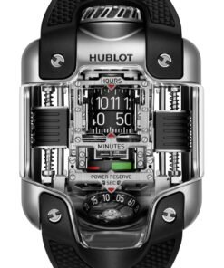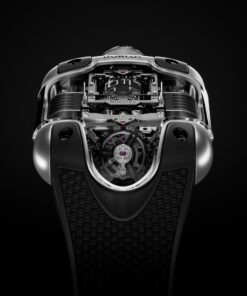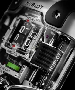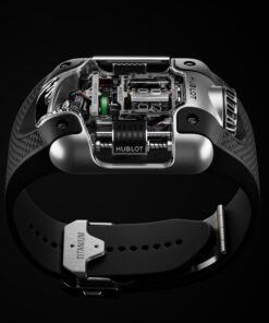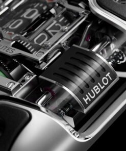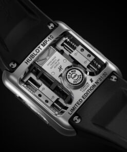 The Hublot MP-10 Tourbillon Weight Energy System is a revolutionary watch that redefines the fundamentals of traditional watchmaking. This latest offering from Hublot’s Manufacture Piece collections stands out with its absence of a conventional dial, hands, and oscillating weight, replaced instead by a roller display, a circular power reserve, and an inclined tourbillon, all uniquely powered by two linear weights. Limited to just 50 pieces, this watch is a testament to both mechanical ingenuity and aesthetic sophistication. At the heart of the MP-10’s design is its unique display mechanism. Eschewing traditional hands, the watch features four constantly rotating displays for hours, minutes, power reserve, and seconds. The time is read in a vertical manner, flowing naturally from top to bottom, which is a departure from the norm. The MP-10 Tourbillon Weight Energy System’s movement is ingeniously integrated with the dial, making the movement both the face and the soul of the watch. A significant innovation in the MP-10 is its automatic winding system, which departs radically from traditional designs. In place of a flat dial paired with an oscillating weight, the MP-10 features two white gold weights, positioned vertically on either side of the central architecture. These weights wind the movement bidirectionally, a feature unique to Hublot and protected by a pending patent. In terms of technical prowess, the MP-10 is a marvel. It incorporates 592 components, is the product of 5 years of research and development, and features a singular mechanical configuration that is pending patent protection. The watch’s power reserve indicator is particularly striking, characterized by a two-tone disc that is both functional and visually compelling. Despite its avant-garde design and complex features, the MP-10 remains a practical and complete watch. It’s not just a concept or a style exercise; it’s a wearable and functional timepiece that is sure to captivate collectors and watch enthusiasts alike.