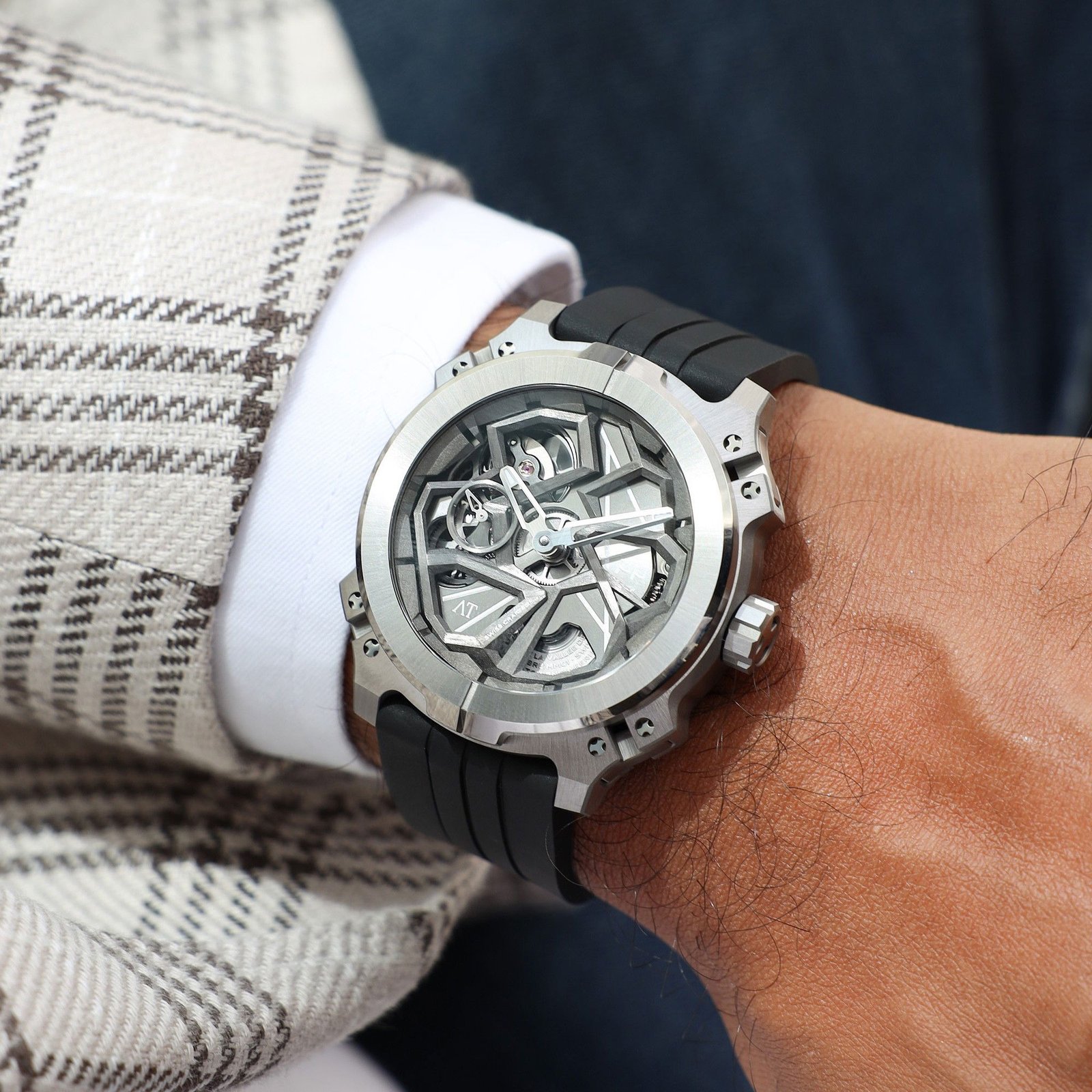 The dial itself is built in three layers, each shaped by algorithms and refined with meticulous finishing. Light plays across every edge and surface, revealing depth and complexity. Inside, the skeletonized MM01-SK movement is framed by a 44mm case with contrasting finishes: polished, brushed, grained, and beveled. These textures bring out the architectural feel of the piece. Tiny details, like logos, inscriptions, and serial numbers are engraved with care, turning even the smallest features into visual highlights.