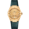 This 29 mm 18K Sedna™ gold model features a bezel with engraved Roman numerals, pearled mother-of-pearl dial with diamond hour markers and a date window at the 6 o’clock position. The hands, OMEGA logo, Constellation star and diamond holders are also in 18K Sedna™ gold.