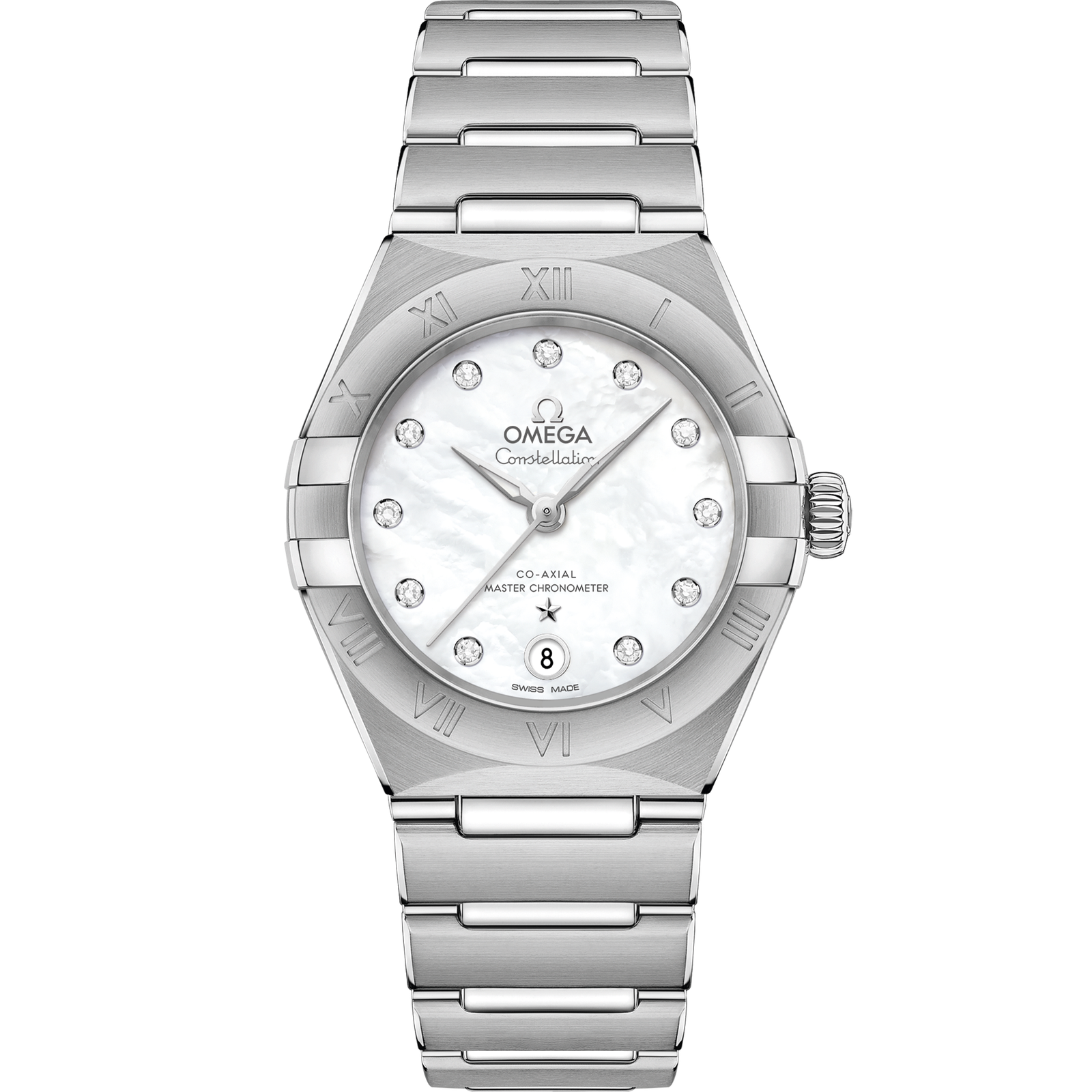 This 29 mm stainless steel model features a bezel engraved with Roman numerals, pearled mother-of-pearl dial with diamond hour markers and a date window at the 6 o’clock position. The hands, OMEGA logo, Constellation star and diamond holders are in 18K white gold.