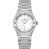 This 29 mm stainless steel model features a diamond-paved bezel, pearled mother-of-pearl dial with diamond hour markers and a date window at the 6 o’clock position. The hands, OMEGA logo, Constellation star and diamond holders are in 18K white gold.