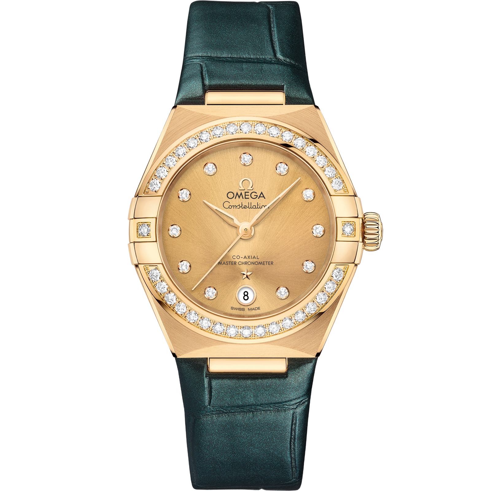 This 29 mm 18K yellow gold model features a diamond-paved bezel, sun-brushed champagne dial with diamond hour markers and a date window at the 6 o’clock position. The hands, OMEGA logo, Constellation star and diamond holders are also in 18K yellow gold.