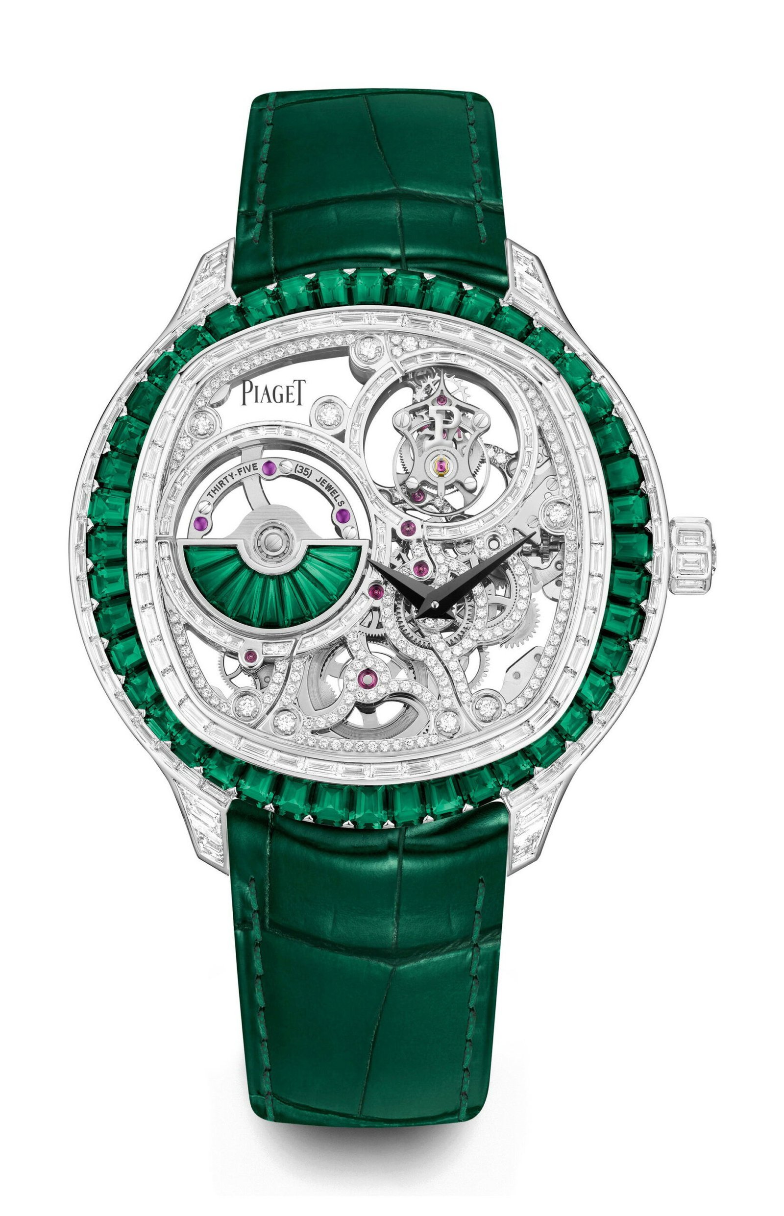 The Piaget Polo Emperador Skeleton Tourbillon High Jewellery watch is an exquisite and rare timepiece, distinguished by its radiant combination of emeralds and diamonds. Born in Piaget’s High Jewellery workshops, the watch showcases the legacy of the brand’s dedication to superior jewellery craftsmanship dating back to 1959. Notably, the 1270D movement, an opulent rendition of previous automatic tourbillons, is intricately adorned with diamonds. This involves meticulous attention to detail, demanding over 140 hours of work to ensure every diamond and precious material fits perfectly. The movement and case alone take 100 hours, with an additional 40 hours to set diamonds on the tourbillon. The dial boasts a captivating oscillating weight adorned with trapeze-cut emeralds and a signature ‘P’ marking the seconds on the flying tourbillon. This 49mm Piaget Polo watch, available in various gem settings, echoes the brand’s unique synthesis of watchmaking and jewellery craftsmanship.
