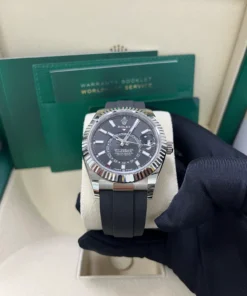 The Oyster Perpetual Sky-Dweller in 18 ct white gold with a bright black dial and an Oysterflex bracelet.