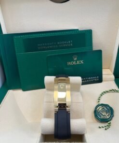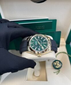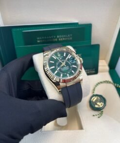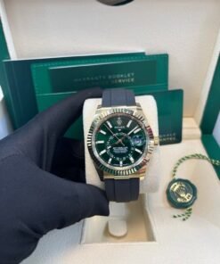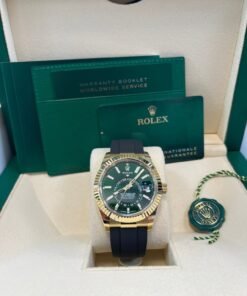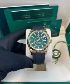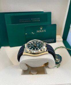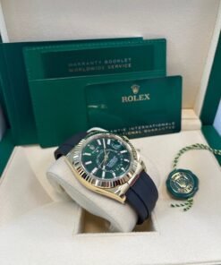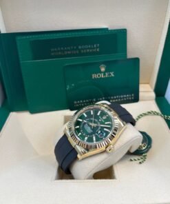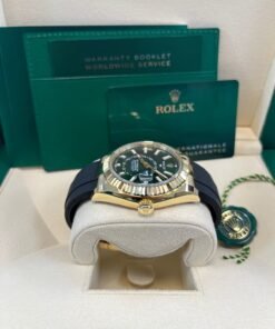 Model case Oyster, 42 mm, yellow gold Oyster architecture Monobloc middle case, screw-down case back and winding crown Diameter 42 mm Material 18 kt yellow gold Bezel Fluted, bidirectional rotatable Rolex Ring Command Winding crown Screw-down, Twinlock double waterproofness system Crystal Scratch-resistant sapphire, Cyclops lens over the date Water resistance Waterproof to 100 metres / 330 feet Movement Perpetual, mechanical, self-winding, dual time zones, annual calendar Calibre 9002, manufacture Rolex Precision -2/+2 sec/day, after casing Functions Centre hour, minute and seconds hands. 24-hour display on off-centre disc. Second time zone. Instantaneous annual calendar at 3 o’clock and rapid-setting of the date. Month display via 12 apertures around the circumference of the dial. Stop-seconds for precise time setting Oscillator Paramagnetic blue Parachrom hairspring. High-performance Paraflex shock absorbers Winding Bidirectional self-winding via Perpetual rotor Power reserve Approximately 72 hours Bracelet Oysterflex Material Flexible metal blades overmoulded with high-performance elastomer Clasp Folding Oysterclasp with Rolex Glidelock extension system Dial Bright green Details Highly legible Chromalight display with long-lasting blue luminescence