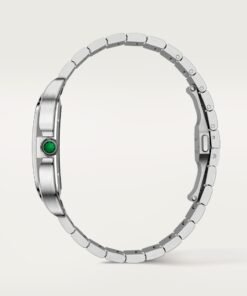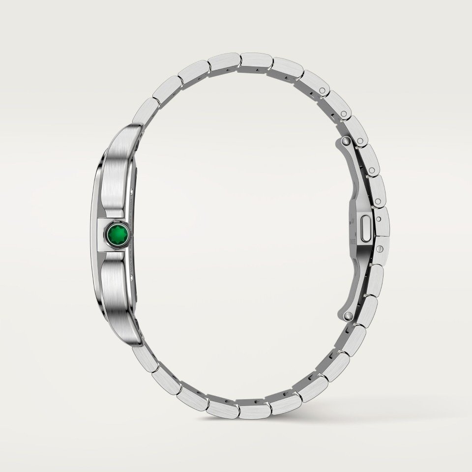 Steel case, 7-sided crown set with a green jasper, gray steel sword-shaped hands, sapphire crystal and case back. Steel bracelet with SmartLink adjustment system. Second strap in green alligator leather, with interchangeable steel deployant buckle. Both straps are fitted with the “QuickSwitch” interchangeability system. Hours and minutes with skeletonized bridges forming Roman numerals, covered in green lacquer.