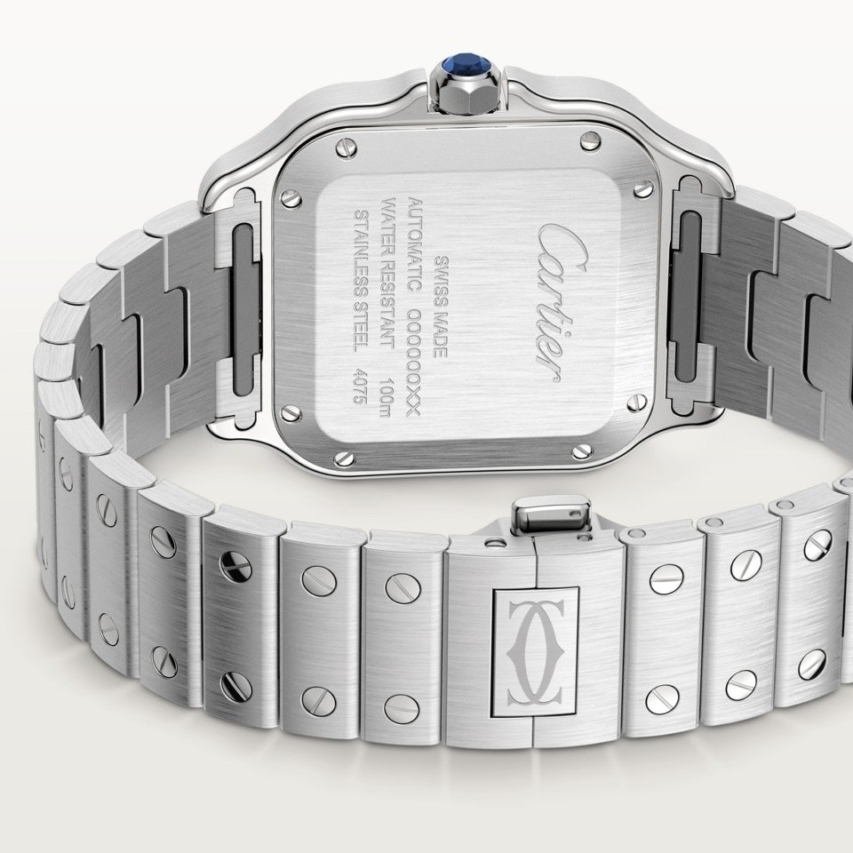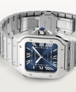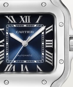 Santos de Cartier watch, medium model, mechanical movement with automatic winding 1847 MC. Steel case, 7-sided crown with synthetic faceted blue spinel, graduated blue dial, polished steel sword-shaped hands with luminescent material, sapphire crystal. Steel bracelet with SmartLink adjustment system. Second strap in blue alligator skin, with interchangeable folding steel buckle. Both are fitted with the QuickSwitch interchangeable system. Case width: 35.1 mm, thickness: 8.83 mm. Water-resistant up to 10 bar (approx. 100 meters/330 feet).