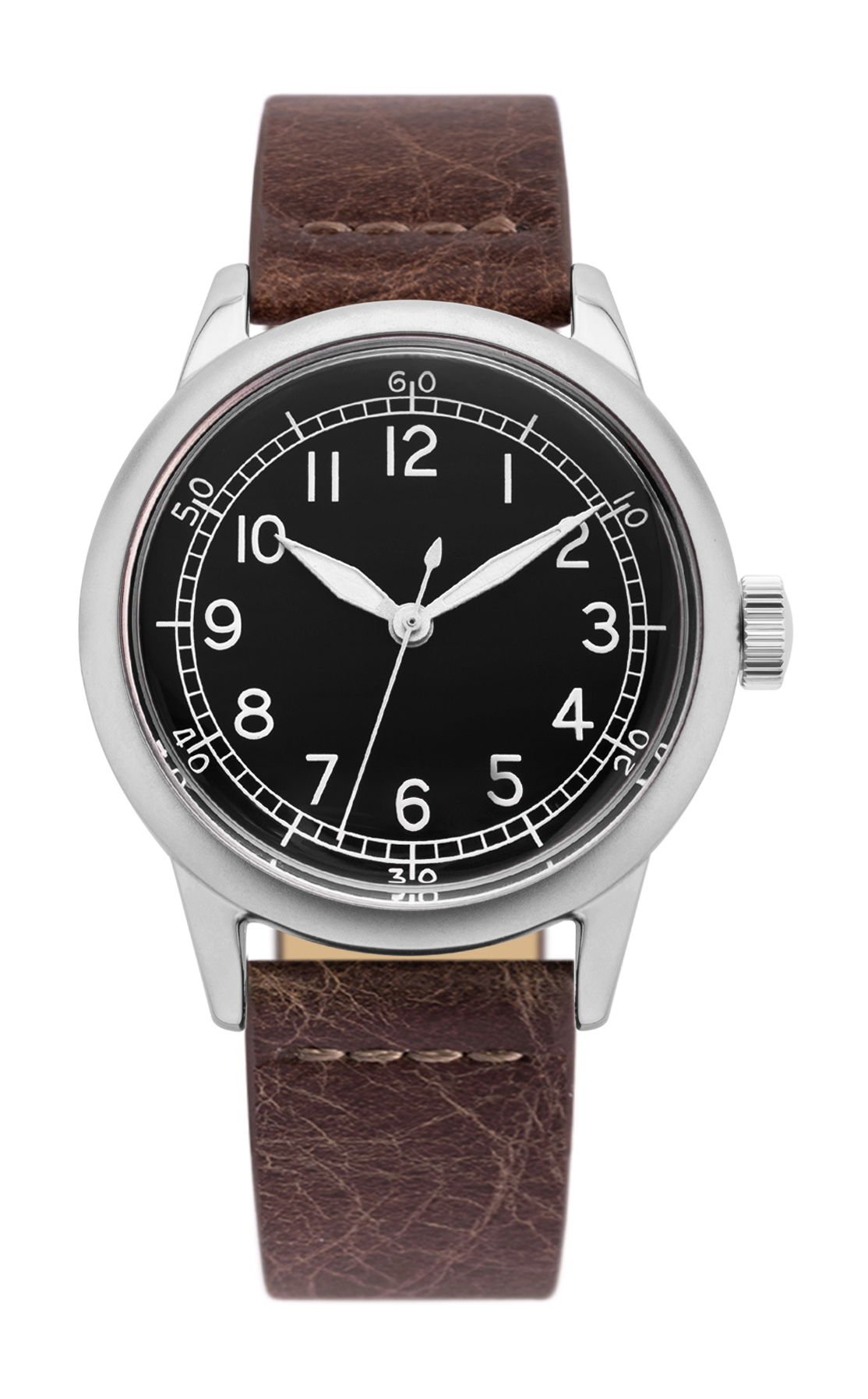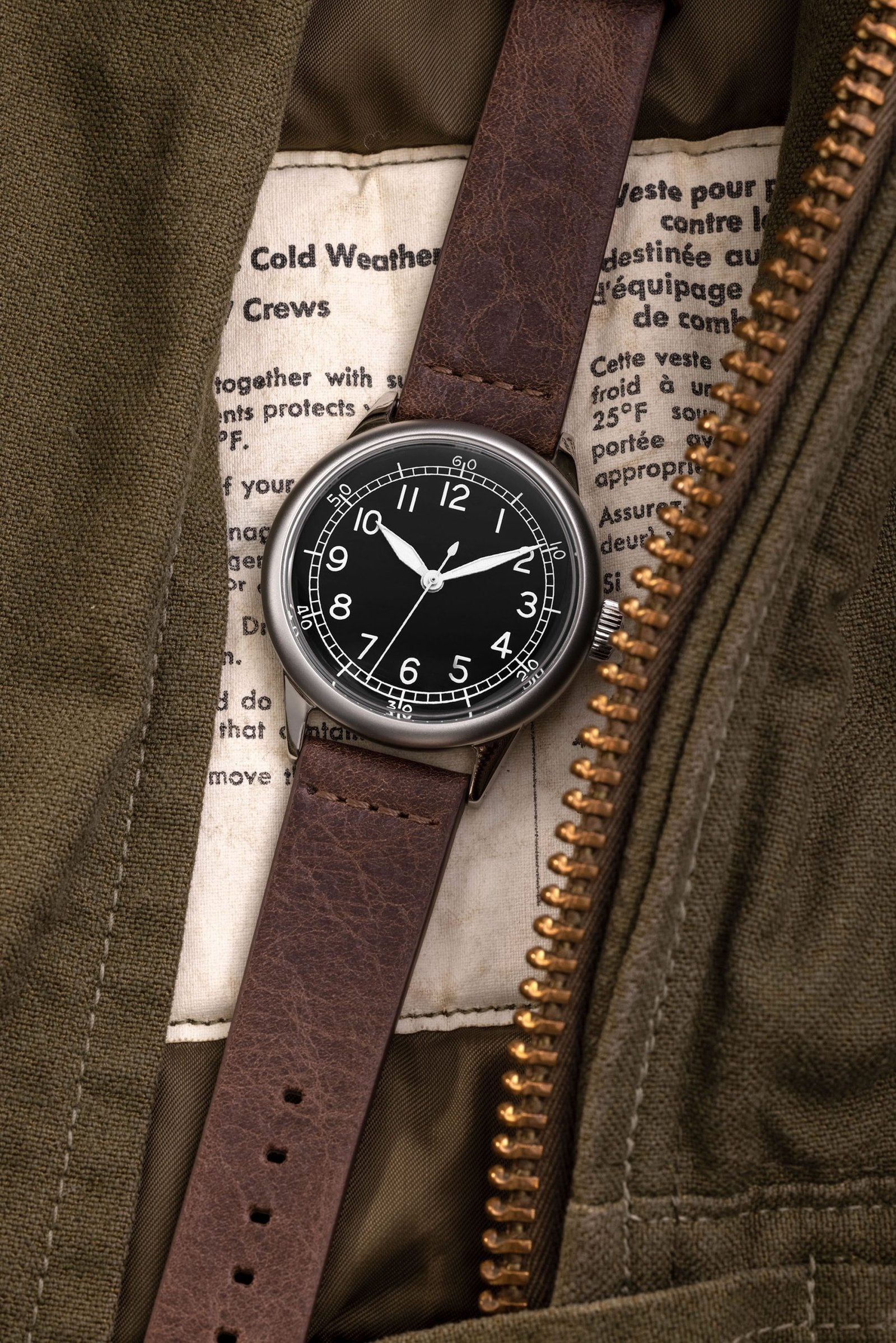 Featuring the most authentic dial in the collection, the “Original Leather” resembles a factory-fresh A-11 from 1942. The matte black dial with white-silver indexes ensures exceptional legibility, a necessity given the operational demands during WW2. The distinctive minute and hour indexes harken back to the era when these watches were hand-painted. All those minute imperfections in this model have been retained to preserve the authenticity of an original. The case is available in either a 32mm or in a 40mm size. The main case body is sandblasted to eliminate any gloss, in true field watch fashion. However, as a nod to the original shiny chrome plating found on most A-11s, the lugs are polished. The brown leather strap balances the field watch look, giving the watch a more versatile appeal. It is suitable for both rugged environments and situations requiring a touch of elegance.