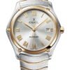 Women’s EBEL Sport Classic watch, stainless steel and 18K yellow gold case with 59 diamonds (0.384ct), Ø 33mm, green mother-of-pearl dial with applied Roman numerals and 8 diamonds (0.052ct), sapphire crystal with antireflective treatment underneath, two-tone stainless steel wave link bracelet with a folding clasp, Swiss quartz movement, water-resistant up to 5 bar