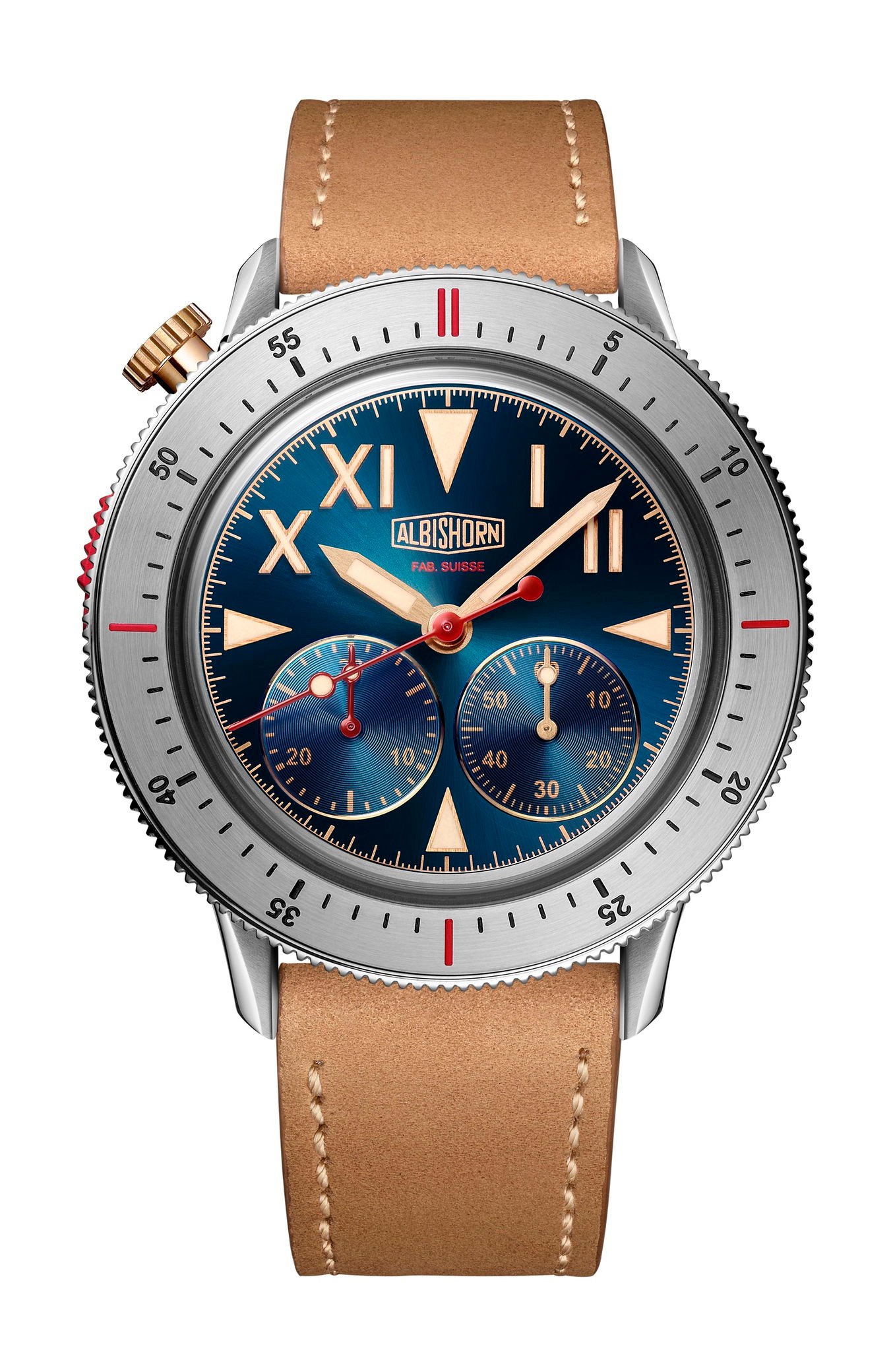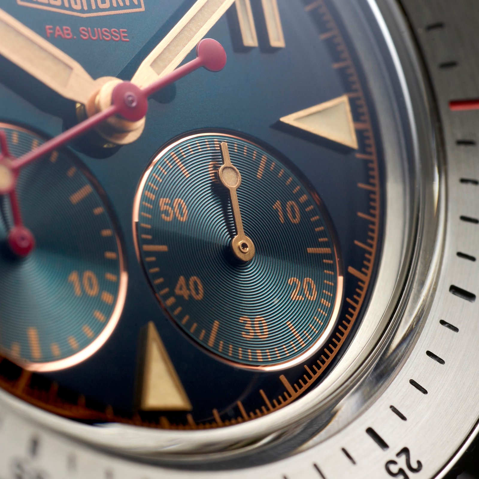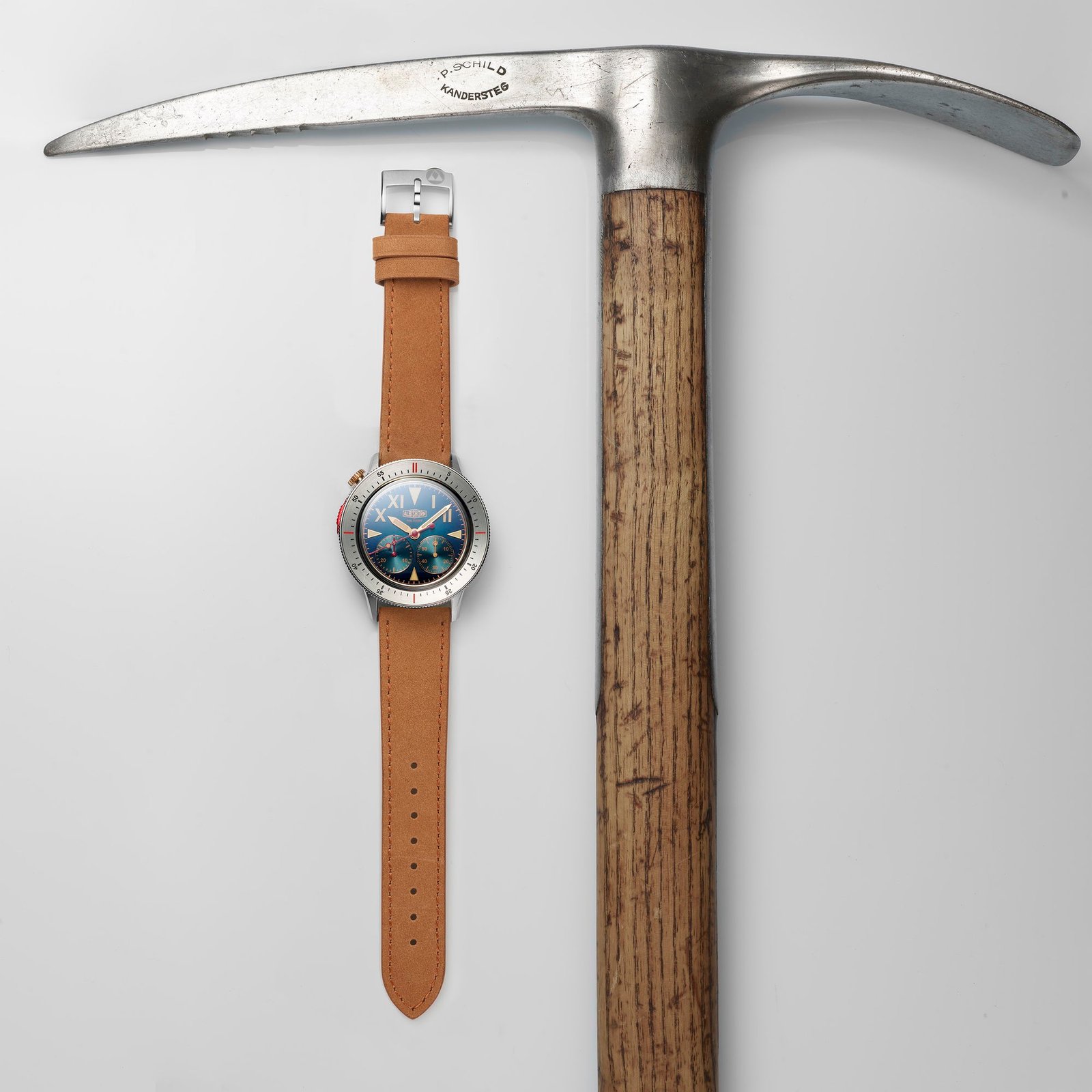 Albishorn continues its journey through the annals of horology with the Thundergraph, a chronograph designed as if it were the ultimate tool watch for the Swiss 1952 Mount Everest expedition. This “Imaginary Vintage®” timepiece fills a hypothetical gap in history, blending mid-century design with modern craftsmanship. The concept? A rugged yet elegant alpine chronograph, built to withstand extreme cold, altitude, and the unforgiving elements of the Himalayas. The Thundergraph’s dial is a masterclass in readability and vintage-inspired design. Featuring the “California ghost” dial, it maintains the iconic split layout but omits Arabic numerals in favor of two strategically placed subdials. Luminescent hands, oversized Roman numerals, and triangular indexes ensure visibility in low-light conditions, while the oversized conical bezel—designed for easy grip with gloves—adds both form and function. The crown at 10:30 and monopusher at 9:30 reflect thoughtful ergonomics, allowing for seamless operation even in harsh conditions. Under the hood, the Thundergraph houses a proprietary hand-wound chronograph movement, developed in La Chaux-de-Fonds and certified by COSC for superior accuracy. With an ultra-thin 5.70 mm movement height and an impressive 65-hour power reserve, it recalls the golden age of Swiss chronographs while delivering modern precision. The stainless steel case, optional bronze crown, and engraved case back (featuring a Swiss cross and rope motif) reinforce its alpinist heritage. From its historically inspired roots to its tool-watch practicality, the Albishorn Thundergraph is a tribute to mountaineering history. The chronograph that might have been—but thanks to Albishorn, now is.